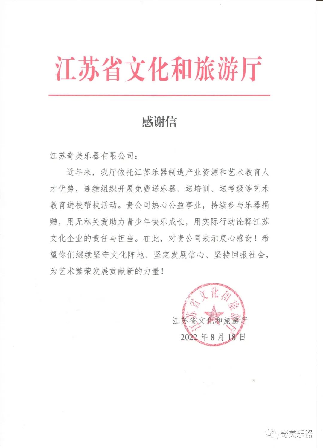 近日,奇美公司收到了來自江蘇省文化和旅游廳的感謝信,感謝奇美公司長期以來對藝術(shù)教育扶貧工作的關(guān)心和支持。